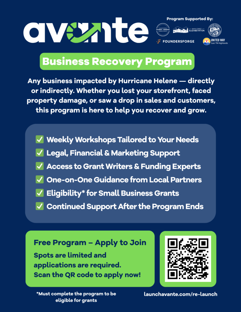In response to the ongoing economic impact of Hurricane Helene, Founder’s Forge launched a new Business Recovery Program, Avante, to support Carter County businesses in rebuilding, stabilizing, and moving forward with confidence. This program is launched in partnership with United Way of East TN Highlands, the Long Term Recovery Group, Elizabethton/Carter County Chamber of Commerce, and Main Street Elizabethton.